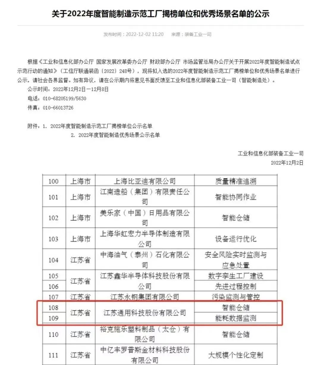 近日,江蘇通用科技股份有限公司獲評2022年度國家智能制造優(yōu)秀場景予以公示。國家級智能制造優(yōu)秀場景是自2021年開始,為落實國家智能制造十