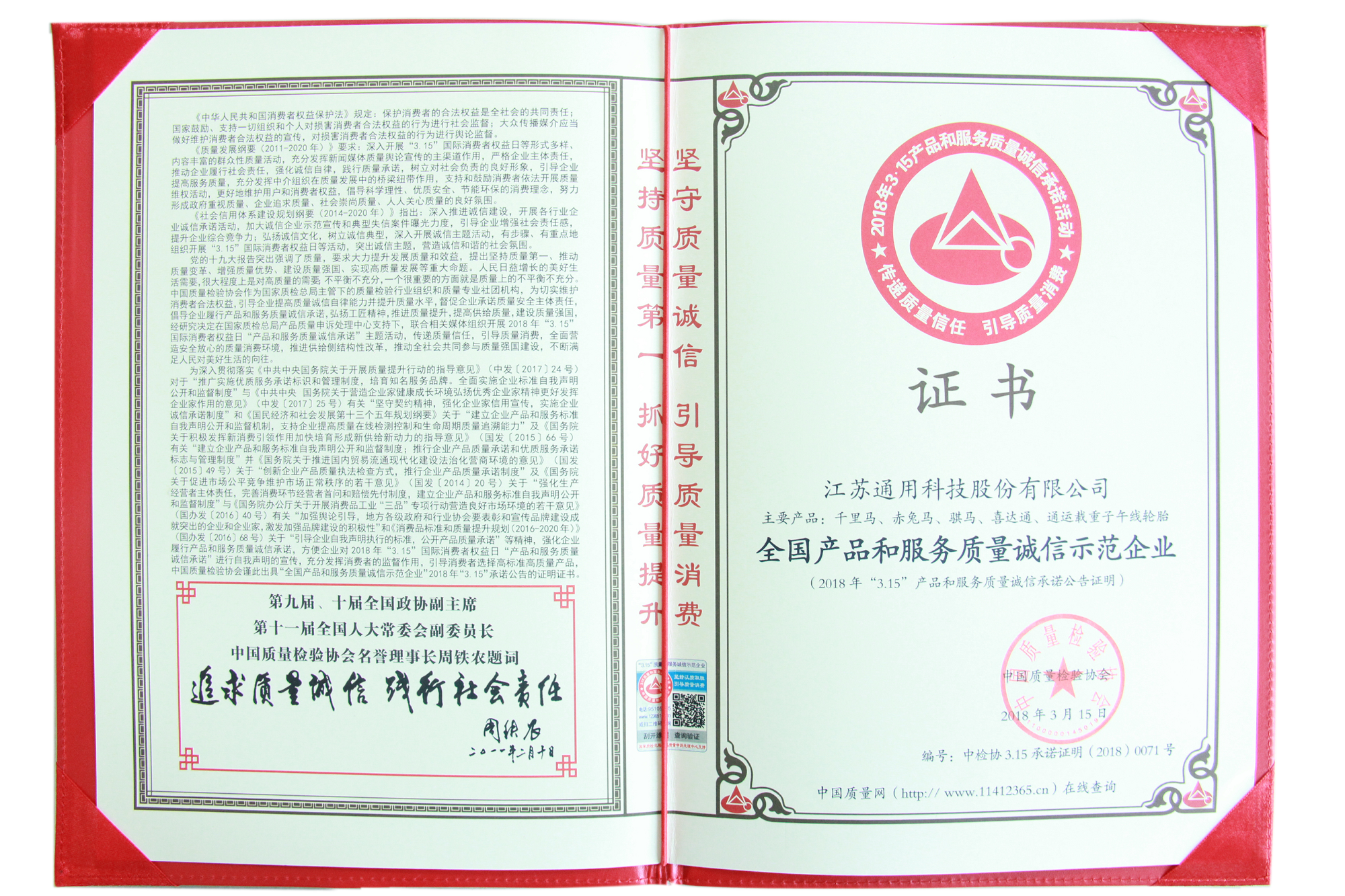 江蘇通用科技股份有限公司自創建以來,高度樹立“產品即人品”的經營理念,緊緊圍繞“全員追求卓越、匠心打造精品”的質量方針,致力于為消費者提供更優性價比的輪胎產品。近日,通用股份憑借旗下五大品牌的卓越品質以及真誠服務,在由國家質檢總局和中國質量檢驗協會聯合開展的“產品和服務質量誠信承諾”主題活動中,榮獲“全國產品和服務質量誠信示范企業”、“全國輪胎行業質量領先品牌”稱號,彰顯了通用股份以質立信、誠信為本的行業操守。